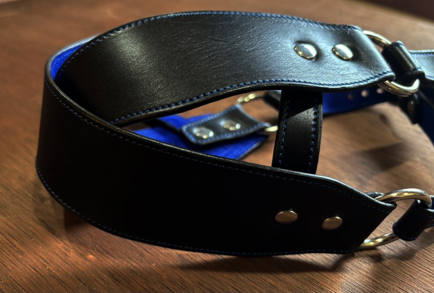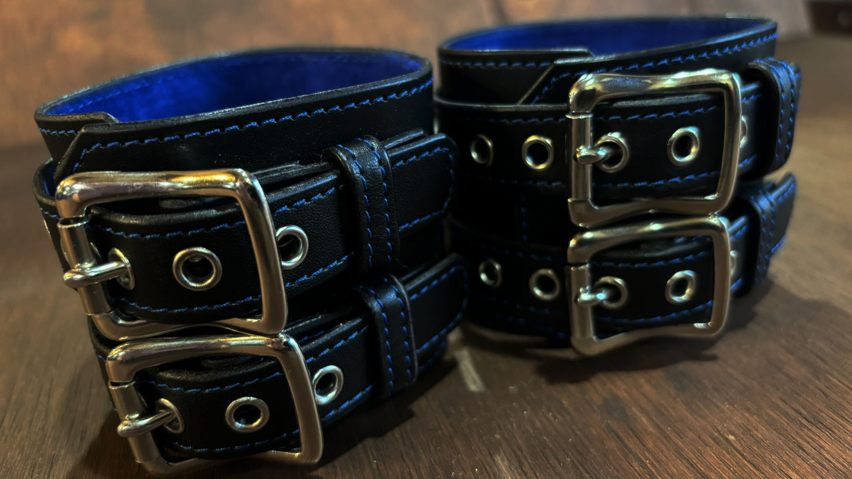 足枷の裏地ブルーバージョンです。本革仕様で裏地はスェードなので長時間装着していても肌を痛めません。
